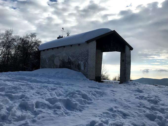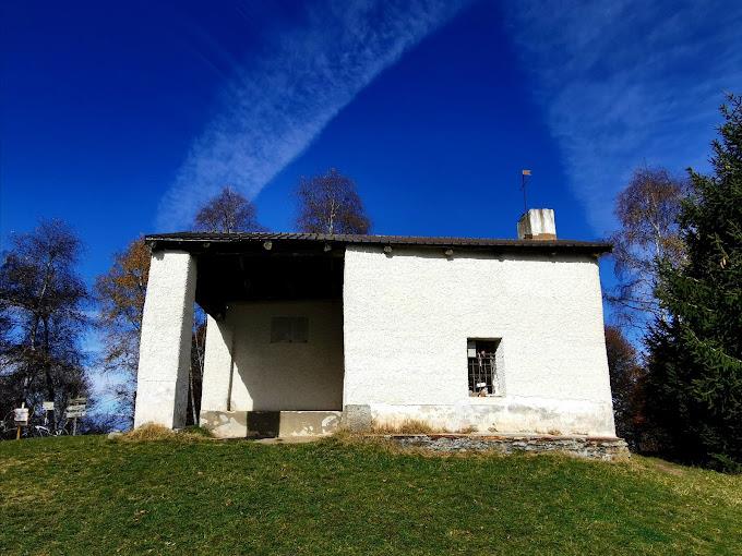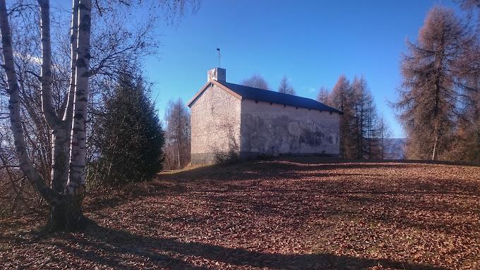 La cappella è spoglia e all’esterno una pietra di confine posta al centro dell’entrata sotto il portico, divide i due Comuni: Piasco e Pagno.
