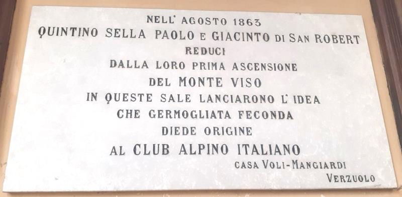 Sotto il porticato che si affaccia sul cortile interno di «Casa Voli-Mangiardi» era stata apposta, a fine Ottocento una lapide in marmo che riporta, a perenne ricordo, quanto segue: «Nell’agosto del 1863 Quintino Sella e Paolo e Giacinto di Saint Robert, reduci dalla loro prima ascensione sul Monte Viso, in quelle sale lanciarono l’idea che germogliata feconda diede origine al Club Alpino Italiano».