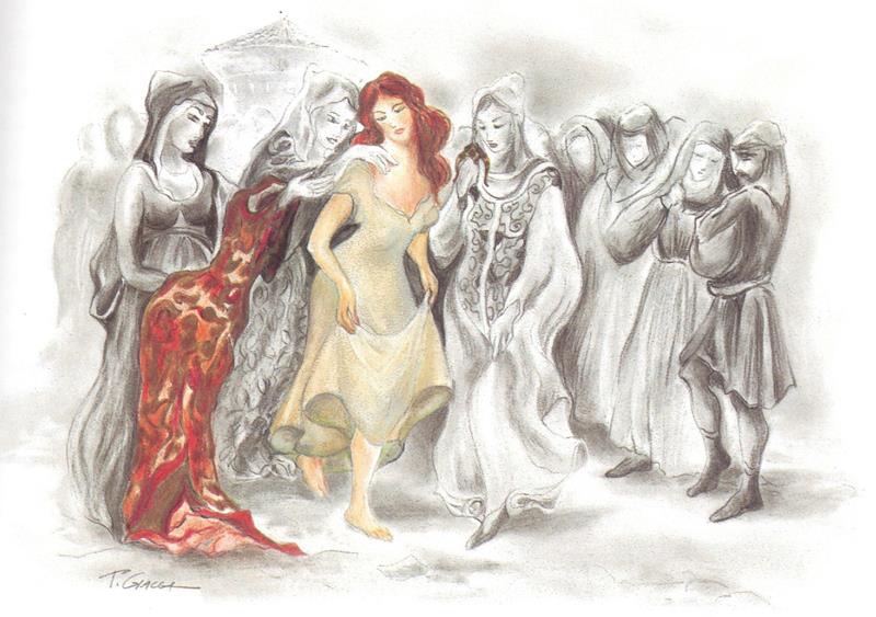 Allora Gualtieri, presala per mano, la menò fuori, ed in presenza di tutta la sua compagnia e d'ogni altra persona la fece spogliare ignuda; e fattisi quegli vestimenti venire che fatti aveva fare, prestamente la fece vestire e calzare, e sopra i suoi capelli, così scarmigliati come erano, le fece mettere una corona, ed appresso questo, meravigliandosi ogni uomo di questa cosa, disse: ''Signori costei è colei la quale io intendo che mia moglie sia, dove ella me voglia per marito''.