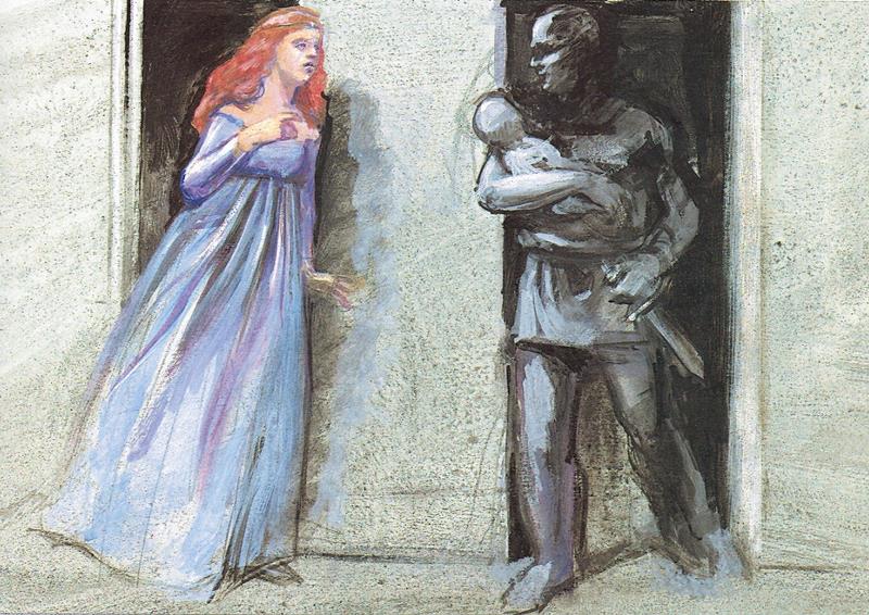 La donna udendo le parole, comprese che a costui fosse imposto che egli l'uccidesse; per che prestamente presala dalla culla e baciatala e nenedettala, in braccio la pose al famigliare e dissegli: ''Te', fa' compiutamente quello che il tuo e mio signore t'ha imposto; ma non la lasciar per modo che le bestie e gli uccelli la divorino, salvo se egli nol ti comandasse''.
