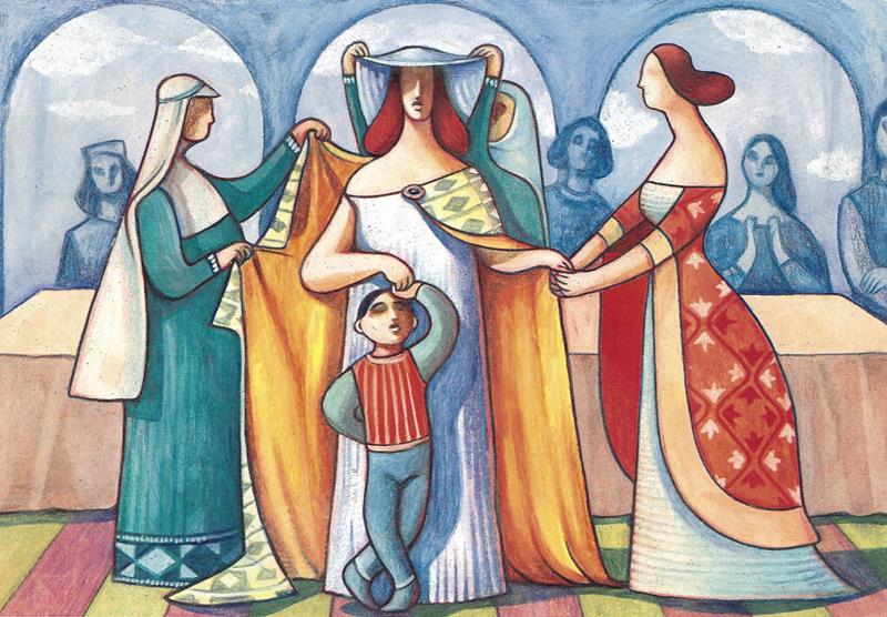 E così detto, l'abbracciò e baciò ... Le donne lietissime, levate dalle tavole, cxon Griselda n'andarono in camera e con migliore augurio trattile i suoi pannicelli, d'una nobile roba delle sue la rivestirono ... e nella sala la rimenarono. E quivi fattasi co' figliuoli meravigliosa festa, essendo ogni uomo lietissimo di questa cosa, il sollazzo ed il festeggiar mutiplicarono ed in più giorni tirarono.