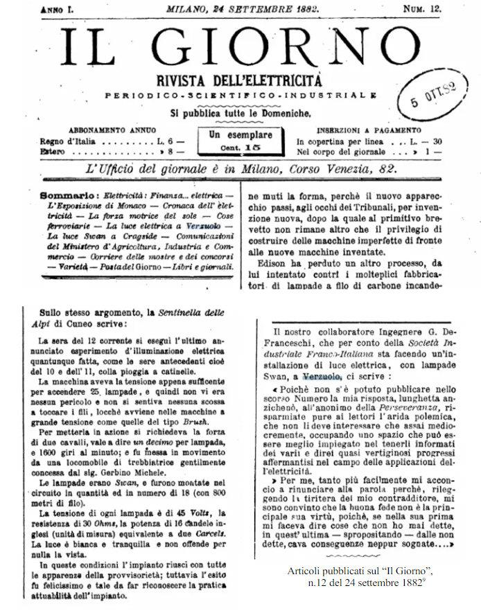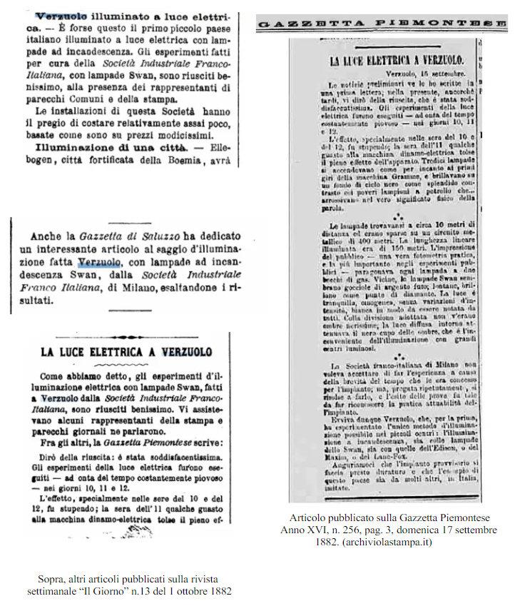 “Come abbiamo detto, gli esperimenti d’illuminazione elettrica con lampade Swan, fatti a Verzuolo dalla Società Industriale Franco-Italiana, sono riusciti benissimo. Vi assistevano alcuni rappresentanti della stampa e parecchi giornali ne parlarono. Fra gli altri, la “Gazzetta Piemontese” scrive: Dirò della riuscita: è stata soddisfacentissima. Gli esperimenti della luce elettrica furono eseguiti – ad onta del tempo costantemente piovoso – nei giorni 10, 11 e 12. L’effetto, specialmente nelle sere del 10 e del 12, fu stupendo; la sera dell’11 qualche guasto alla macchina dinamo-elettrica, tolse il pieno effetto dell’apparato. Tutte le lampade si accendevano come per incanto ai primi giri della macchina Gramme, e brillavano su un fondo di cielo nero, come splendido contrasto coi poveri lampioni a petrolio che arrossivano nel vero significato fisico della parola. Le lampade trovavansi a circa 10 m. di distanza ed erano sparse su un circuito metallico di 400 metri ..."