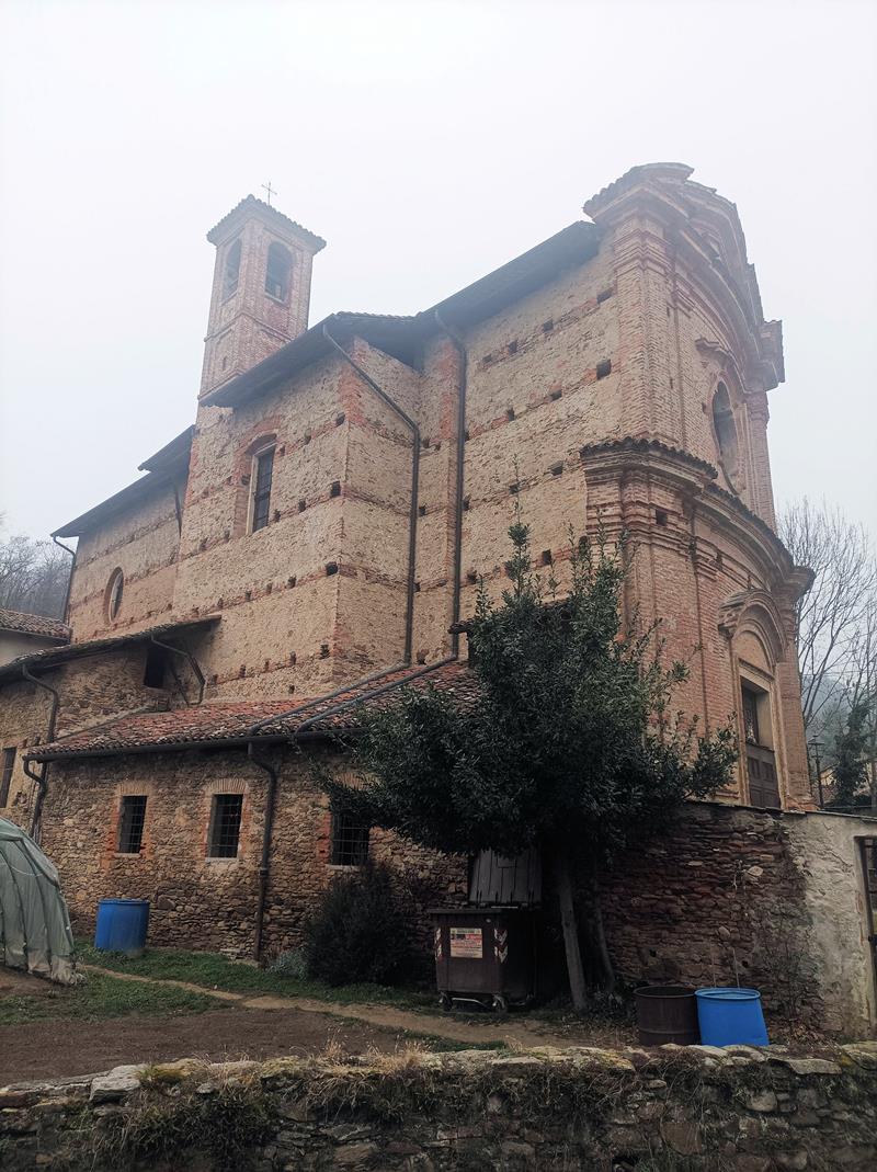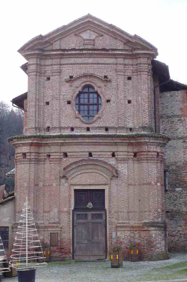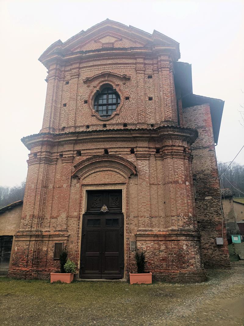 Facciata in cotto a due ordini, ha una sola navata con due cappelle laterali e modesto campaniletto.