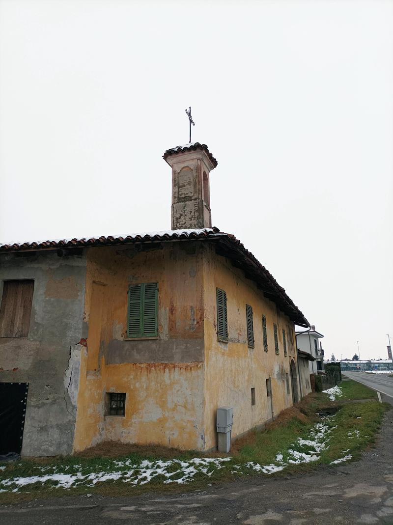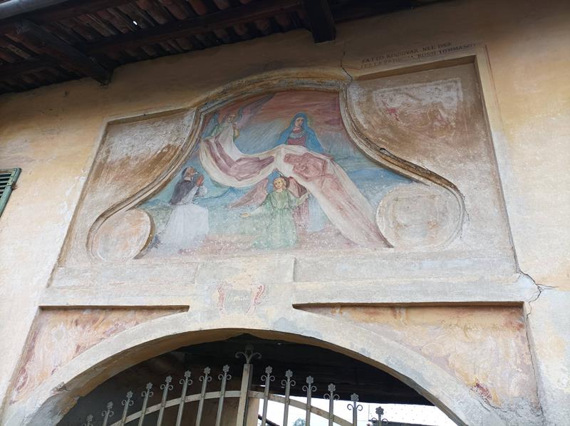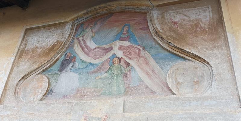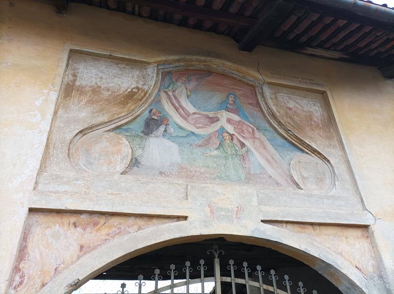 Come l’affresco in via Castello, anche quello di Falicetto è di origine popolare e si trova in una lunetta posta sul portale barocco di una cascina. Esso presenta un'iconografia inconsueta: in un paesaggio che ha sullo sfondo le Alpi e il Monviso, la Sindone, disposta trasversalmente, è presentata dalla Vergine e sostenuta da un angelo in cielo e da un altro in terra, quasi a significare il legame fra terra e cielo. A sinistra nella raffigurazione, inginocchiato in adorazione, si trova san Francesco di Sales, vescovo di Ginevra e dottore della Chiesa che, con la sua appassionata opera di predicatore e di scrittore, aveva cercato di convertire gli eretici calvinisti. La Sindone, cui il santo era molto devoto, può infatti essere considerata un'immagine simbolica della vittoria del cattolicesimo sull'eresia protestante, vessillo della Controriforma che i Savoia costituirono per la loro politica di oppressione sui Riformati. L’affresco può essere fatto risalire alla fine del 1600 ed è stato ridipinto nel 1962.