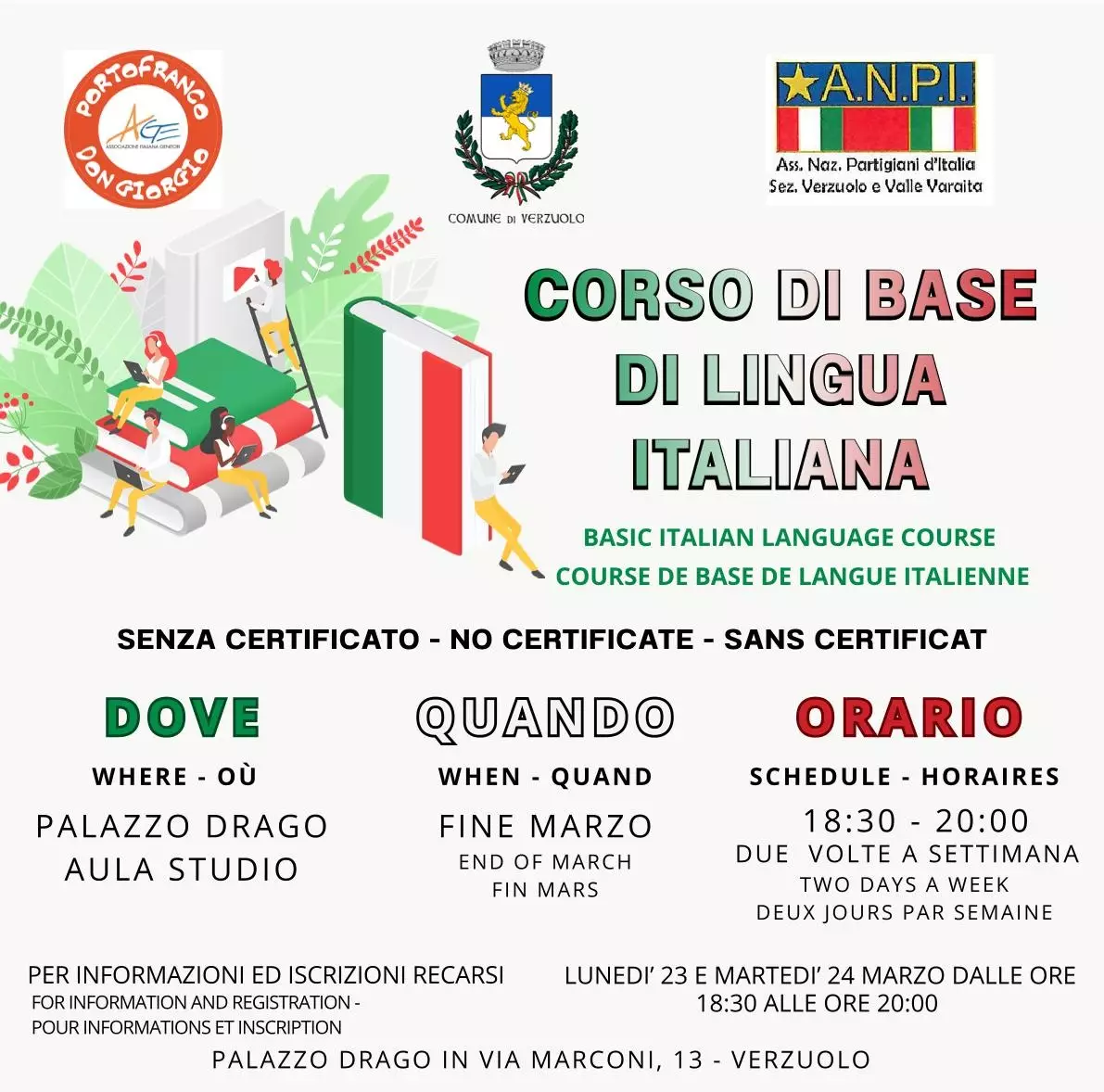Con delibera n. 30 dell'11 marzo 2026 la Giunta comunale di Verzuolo ha accolto l'iniziativa dell’Associazione Nazionale Partigiani d’Italia Sezione Verzuolo e Valle Varaita e dell’associazione Genitori don Giorgio Belliardo ODV - Portofranco per la realizzazione di un corso di base di lingua italiana gratuito, senza rilascio di certificazione finale.