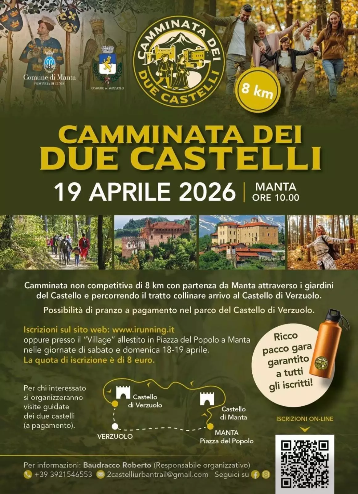 Aperte le iscrizioni alla "Camminata dei due Castelli" in programma il 19 aprile 2026. Una camminata non competititiva di 8 km con partenza ale ore 10:00 da Manta che attraverso i giardini del Castello mantese arriverà a quello Verzuolese percorrendo la collina.